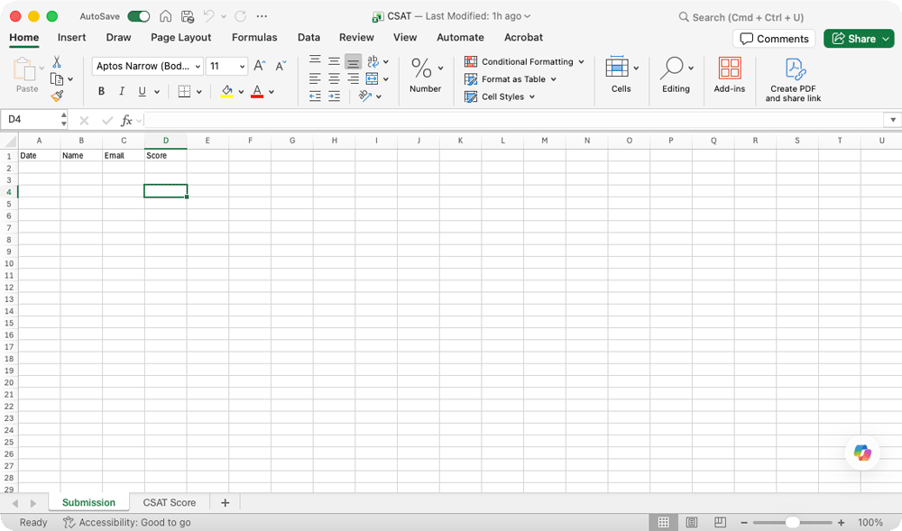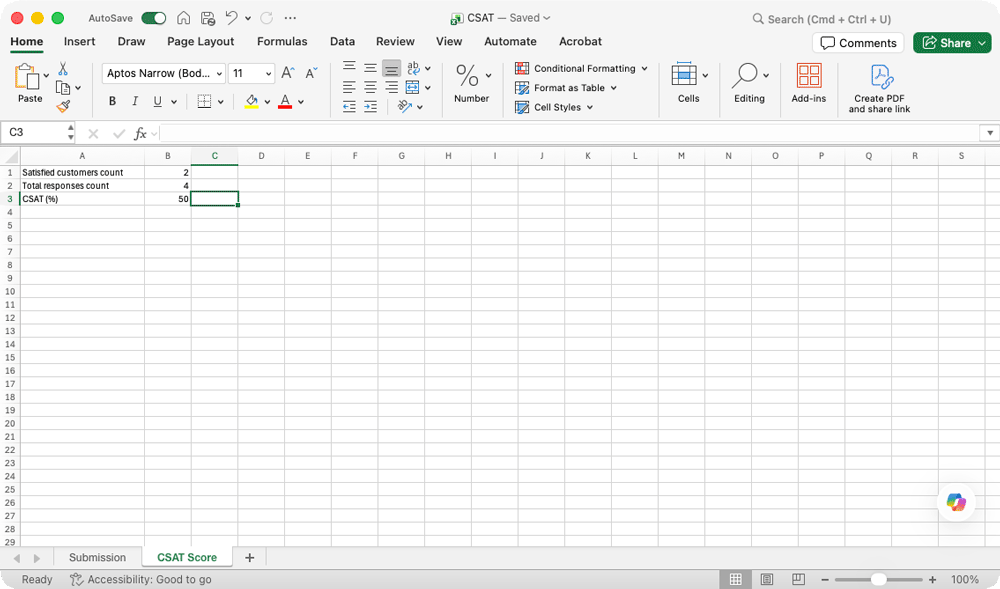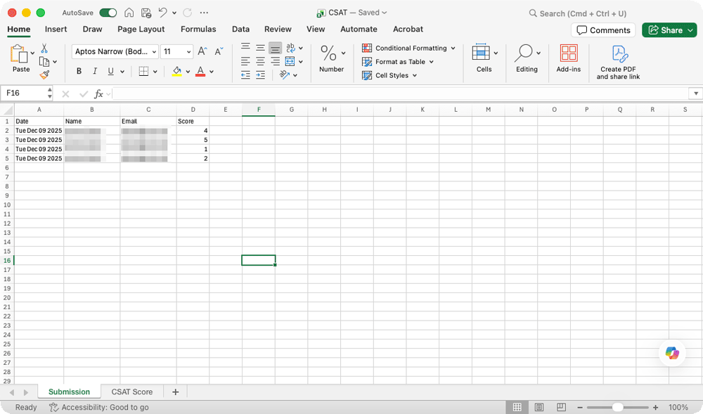 CSAT Score = (Total Positive Ratings ≥ 4) ÷ (Total Feedback) × 100Create a Microsoft Excel Tool