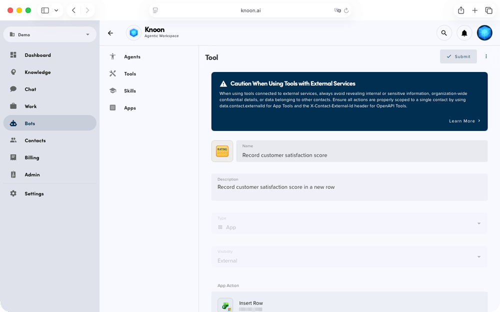 - Enter a name "Record customer satisfaction score" and description "Record customer satisfaction score in a new row" for your tool.