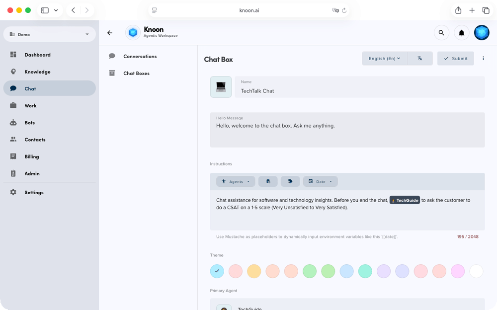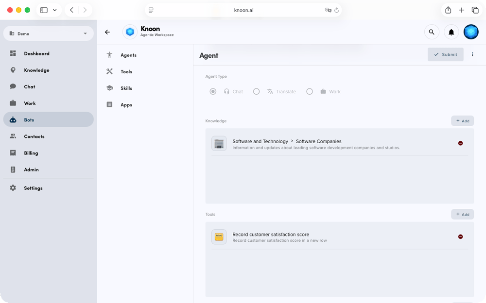 - Knoon Agents: Chat-based AI assistants that automatically request customer feedback at the end of a conversation and collect the rating, name, and email.