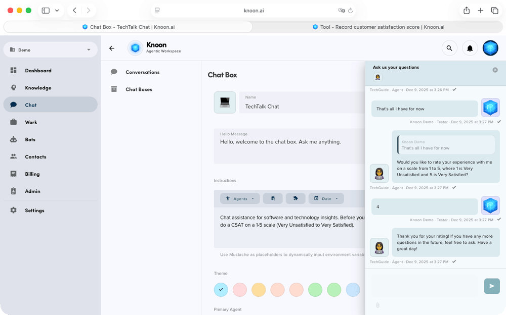 In this demo, we’ll walk through how a Knoon agent automatically collects and records a CSAT score at the end of a support conversation.