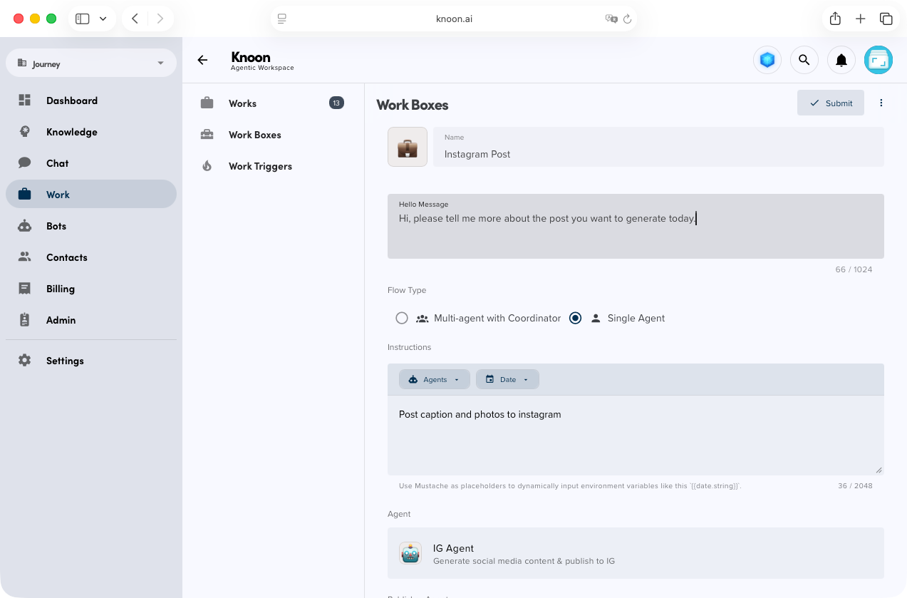 Create a dedicated Publishing Agent and equip it with the social media publishing tool. Then create a workbox using multi-agent with coordinator flow type, assign this agent as the Publisher Agent within your Work Box. Finally, enable human-in-the-loop and turn on publishing approval.